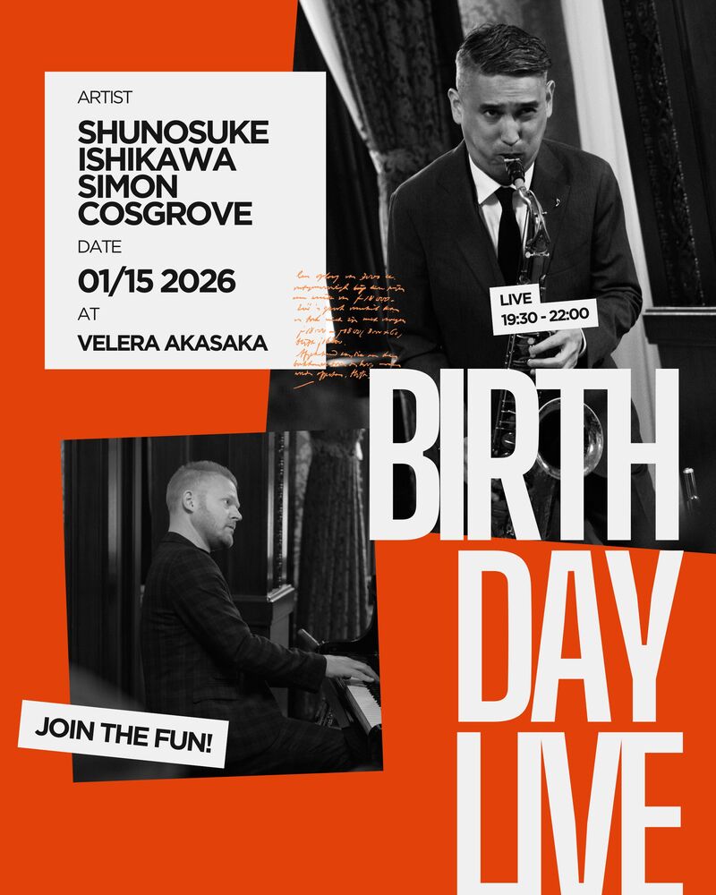 石川周之介バースデーライブ LIVE & EVENTS 2026/01/15(木) 石川周之介バースデーライブ サイモンと2人で演奏します! ぜひふらっと聴きに来てくださいね —— 1/15(木) 赤坂 Velera 19:30–22:00 / M.C ¥3,800 石川周之介 (ts, fl) Simon Cosgrove (p, sax) https://velera.tokyo/schedule/ URLをコピーする 報告する